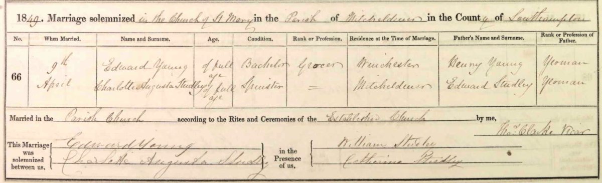 Ancestry shows an Edward Young and Charlotte Augusta Studley married 09-Apr-1849