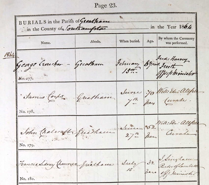 Ancestry shows the Burial Register for Frances Sidney Chawner at Greatham on 15-Jul-1864