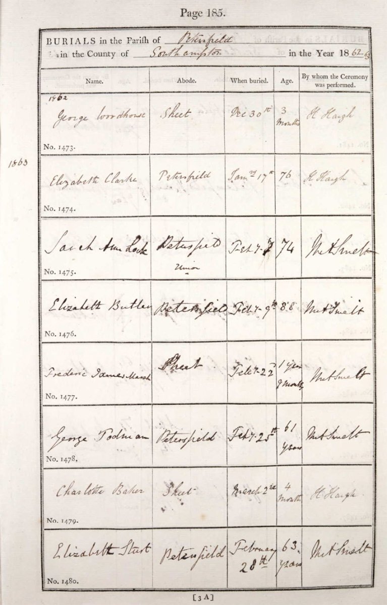 Ancestry shows Elizabeth Sturt buried at Petersfield on 28-Feb-1863