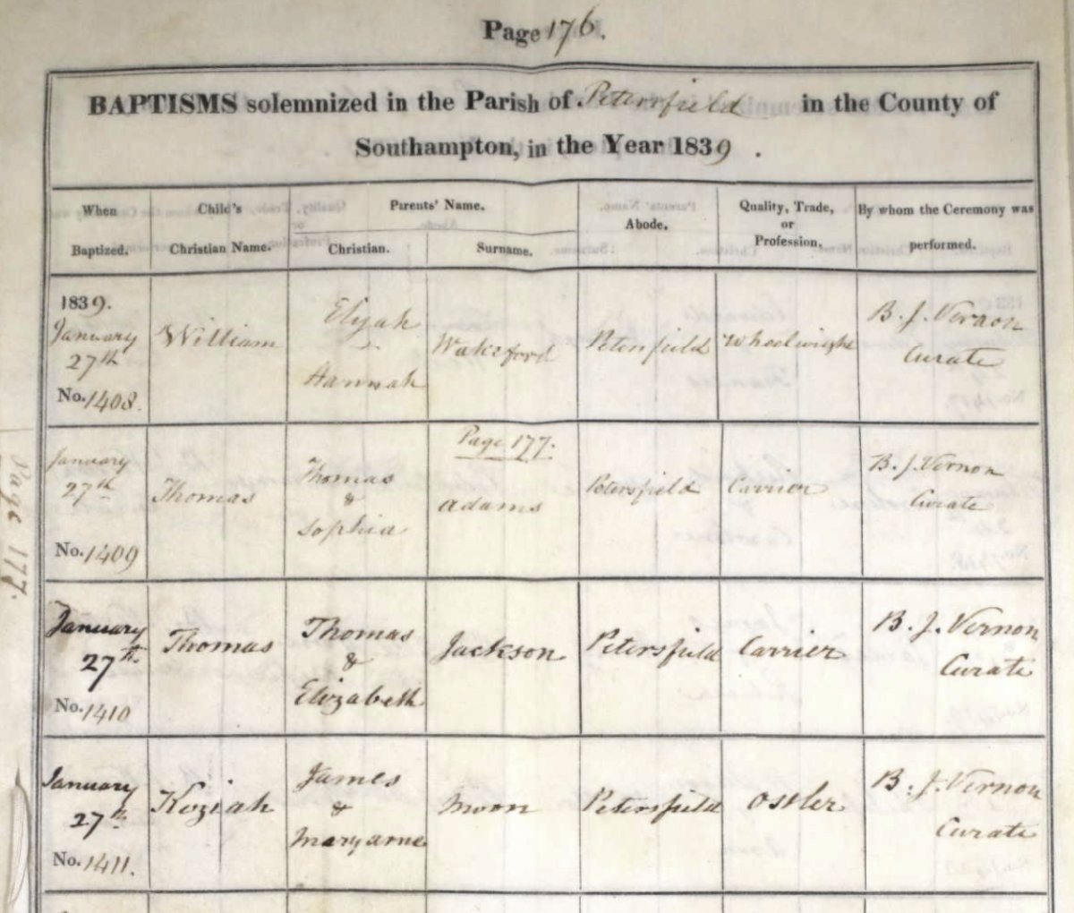and the Baptism register on 27-Jan-1839 at Petersfield