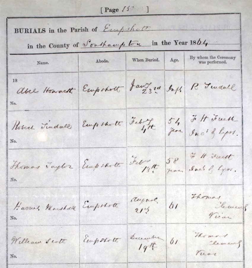 Ancestry shows the Burial Register for 4-Feb-1864 buried at Empshott