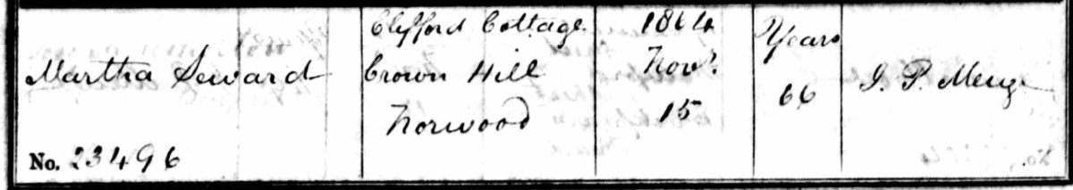 On the 8th inst., at Norwood, Surrey, Martha, youngest daughter of the late Bridger Seward, of Chawton (Chalton), near Petersfield, aged 66.
