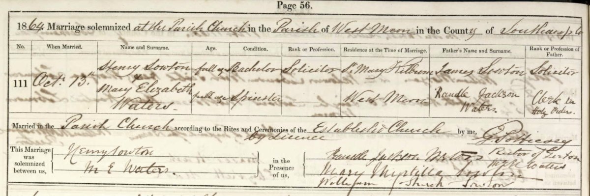On the 13th inst., at Westmeon, Hants, by the Rev. G. Potticary, rector of Girton, assisted by the Rev. T. Waters, brother of the bride, Henry Sowton, of Kilburn, to Mary Elizabeth, youngest daughter of the late Rev. R. J. Waters, D.D.