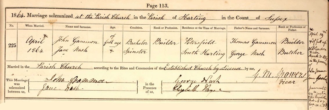 Ancestry shows the marriage at Harting of John Gammon to Jane Nash. Parents Thomas Gammon & George Nash. Witnesses George Nash & Elizabeth ??