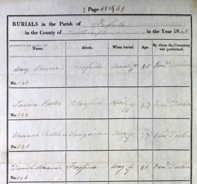 Ancestry shows the death on 29-Apr-1865, and burial on 7-May-1865 at Froxfield