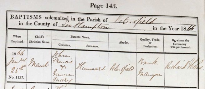 Ancestry shows a Maud Hunnard baptised at Petersfield 25-Jan-1866, daughter of John Francis (Bank Manager) & Emma Mary Hunnard