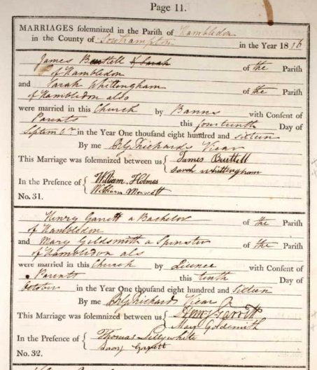 Ancestry shows the Marriage Register for Henry Garrett & Mary Goldsmith at Hambledon on 10-Oct-1816