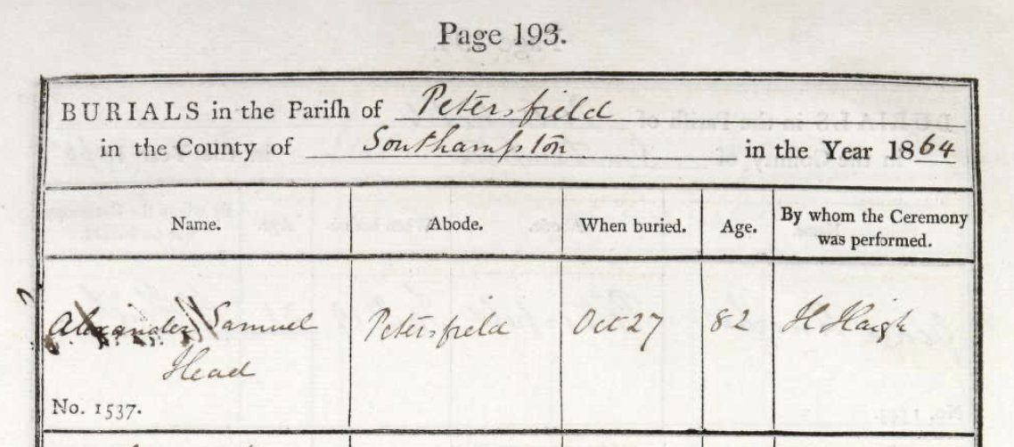 Ancestry shows the burial register for Alexander Samuel Head on 27-Oct-1864