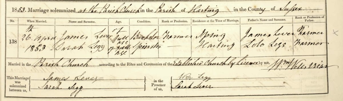 and the marriage of Sarah Legg to James Lever at Harting on 26-Apr-1853