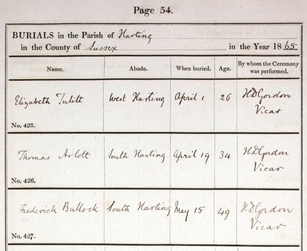 Ancestry shows the burial register on 15-May-1865 at South Harting