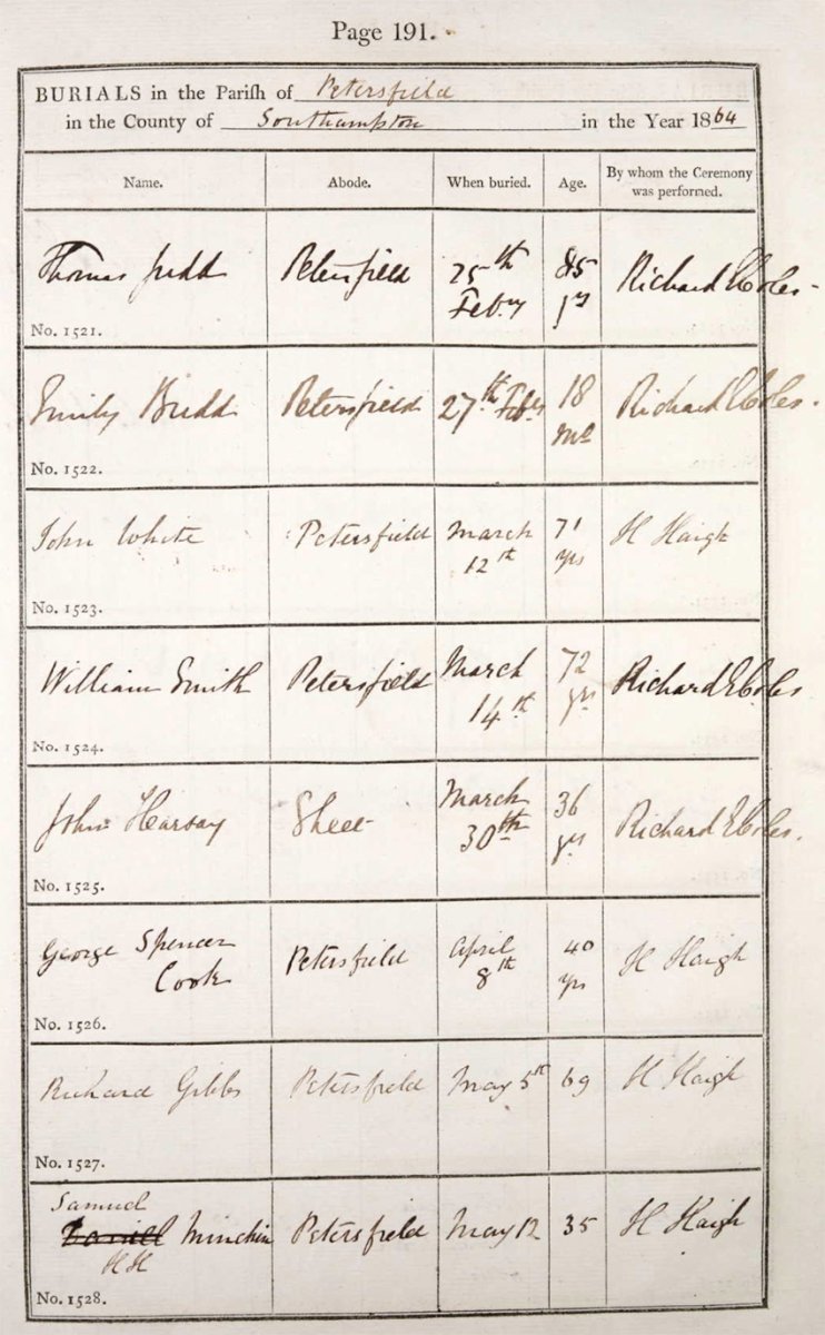 Ancestry shows the burial register for 12-May-1864 at Petersfield.